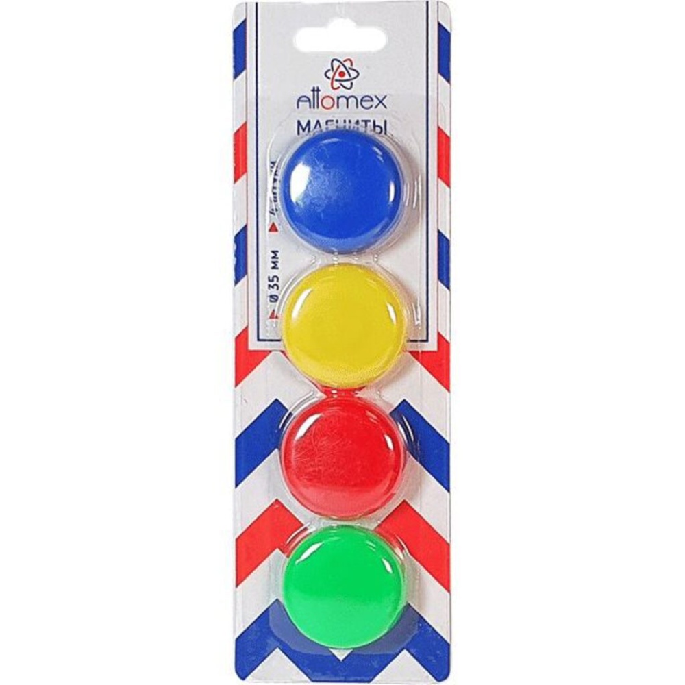 Магнит для доски с пластиковым покрытием момогут надежно прикрепить листы бумаги к магнитно-маркерной поверхности досок, витрин и флипчартов. Надежно удерживаются на любой железной или стальной поверхности. Диаметр магнита составляет 35 мм. 4 штук в комплекте. Поставляется в удобной блистерной упаковке с европодвесом.