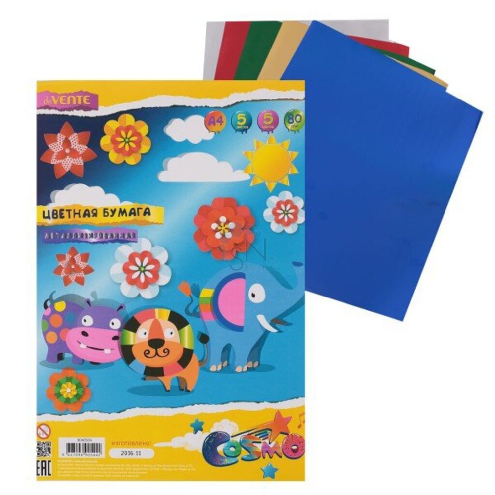 Цветная бумага  металлизированная 5 листов 5 цветов. Плотность  80 г/м2, упаковка пластиковый пакет с европодвесом
