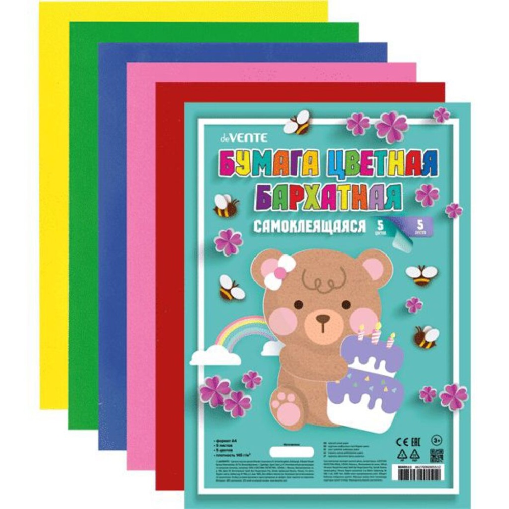 Цветная бархатная  бумага, самоклеящаяся 5 листов 5 цветов. Плотность 145 г/м2 ,упаковка пластиковый пакет с европодвесом