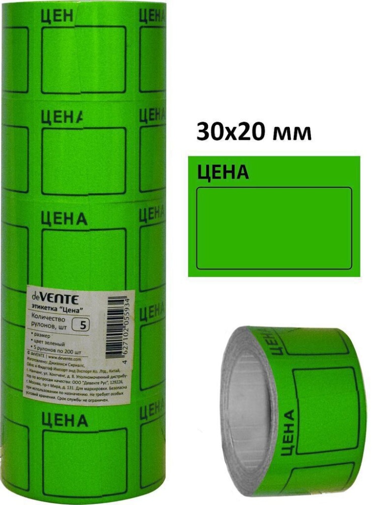 Информационная наклейка "Цена". Размер 30*20 мм.; 200 шт. в ролике. Цвет- зелёный. Указывает стоимость товара. Изготавливаются из бумаги с клеевым слоем на одной из сторон. Поставляются рулонами (защищены вощеной бумагой от слипания). Приклеиваются на товар или на его упаковку. Для самоклеящихся ценников используется клей, который не оставляет следов, легко снимается с упаковки. Они имеют небольшой размер, которого достаточно для указания только основных сведений о продукции (наименование, цена). Их удобно использовать для маркировки большого количества товаров, при организации торговли с открытым доступом к витринам.