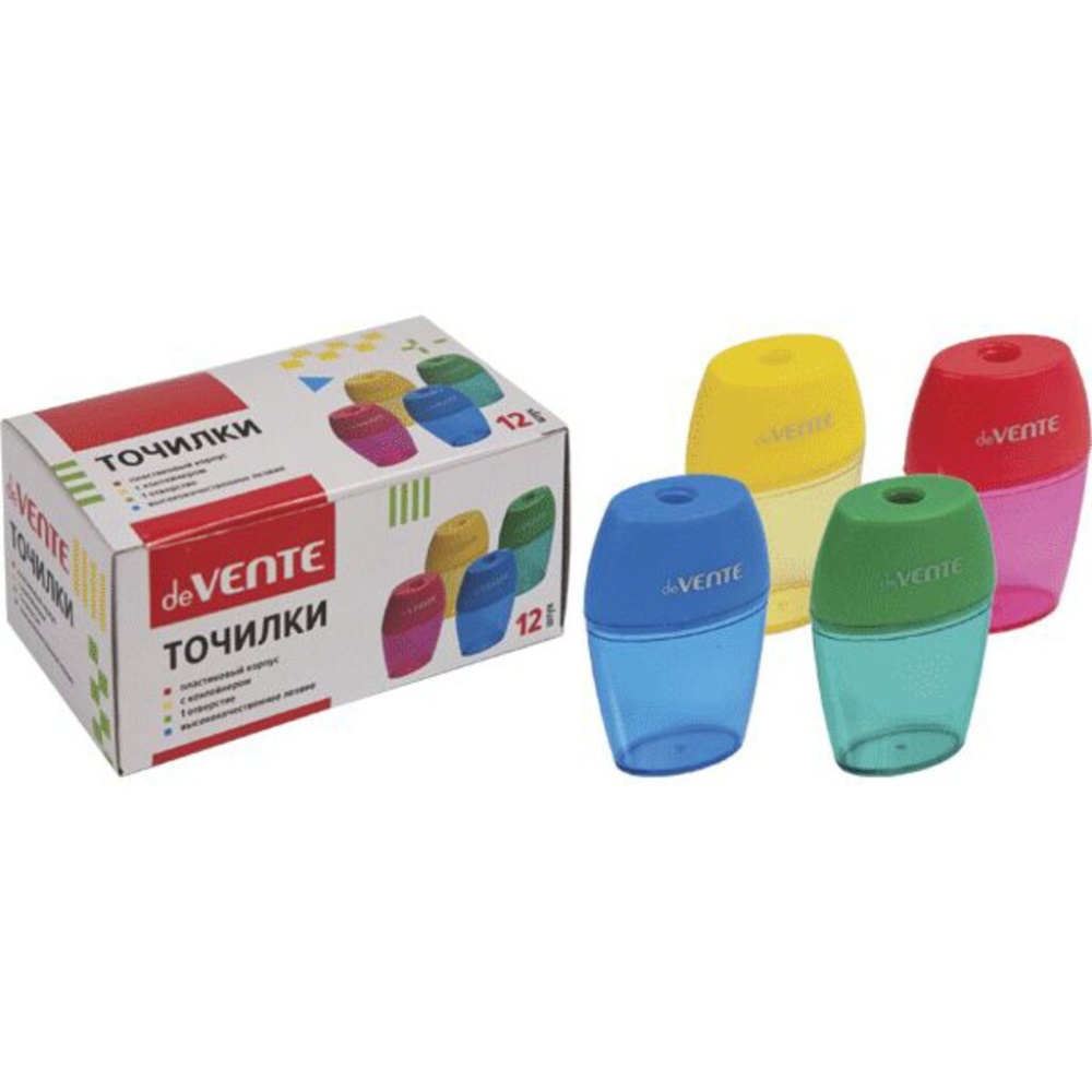 Пластиковая точилка с тонированным контейнером для сбора стружки для заточки стандартных чернографитных и цветных карандашей.