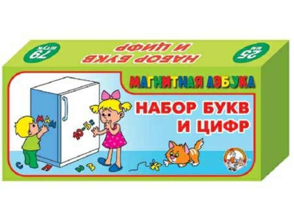 Игрушка из пластмассы и магнитных вставок для детей от 5-ти лет. Данный набор включает в себя 79 букв и цифр высотой 25 мм; комплект вкладышей к ним.