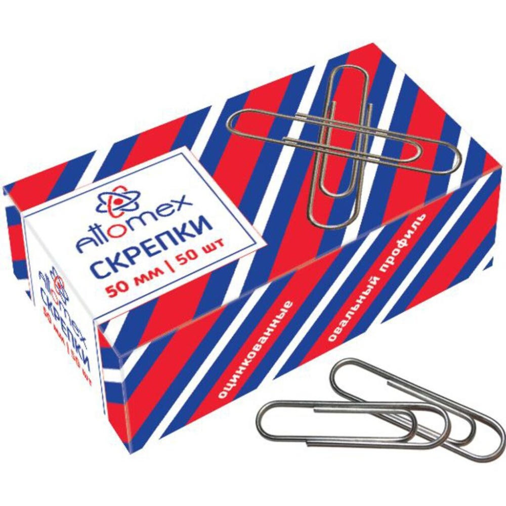 Скрепка канцелярский предмет для скрепления листов бумаги. Скрепки оцинкованные "Attomex", имеют размер 50 мм. Без покрытия. Гладкие, овальной формы. Надежно скрепляют документы, не деформируют бумагу. Упакованы в картонной коробке по 50 скрепок.