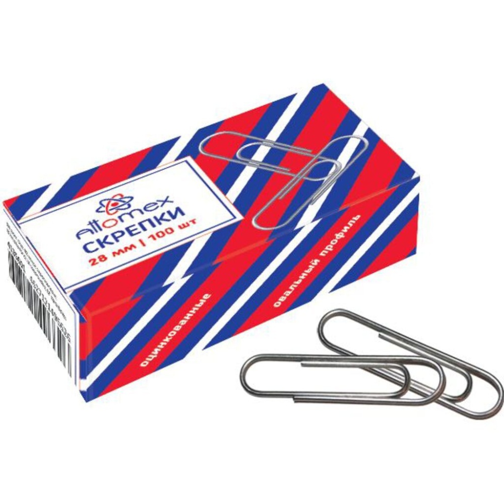 Скрепка канцелярский предмет для скрепления листов бумаги. Скрепки металлические "Attomex", имеют размер 28 мм. Оцинкованные канцелярские скрепки, без покрытия. Гладкие, овальной формы. Надежно скрепляют документы, не деформируют бумагу. Упакованы в картонной коробке по 100 скрепок.