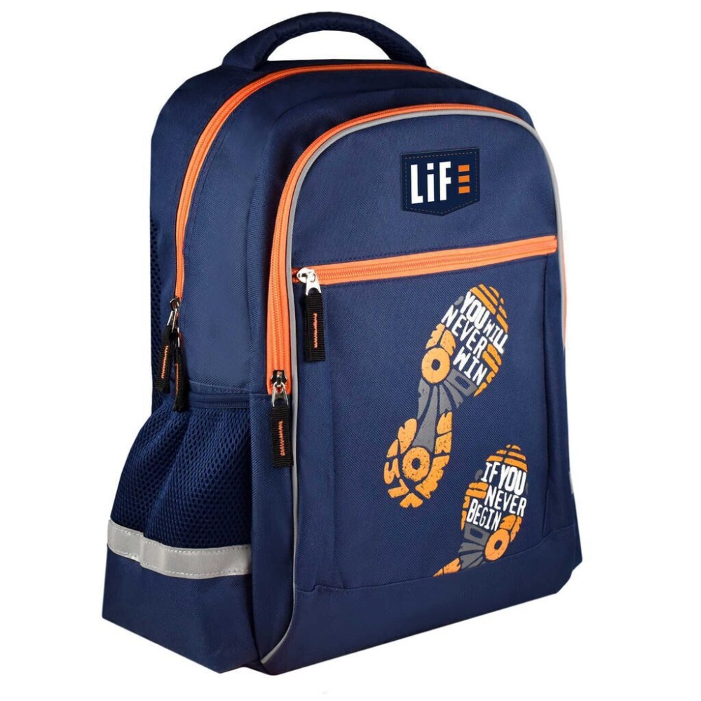 Рюкзак школьный. СЛЕДЫ. Размер: 31х42х15 см. Материал: полиэстер. Количество отделений - 1. Застёжка - молния. Материал собачки: лента репсовая. Форма собачки: хляст. Количество наружных карманов - 4. Тип спинки - формоустойчивая спинка из сетчатой ткани и поролона. Тип дна - с пластиковыми ножками. Отделка: резиновая нашивка, шелкография. Цвет - тёмно-синий. Особенности: водоотталкивающая ткань, лямки, регулируемые по длине, светоотражающие элементы. Подклада: есть. Индивидуальная упаковка: ПЭТ-пакет.