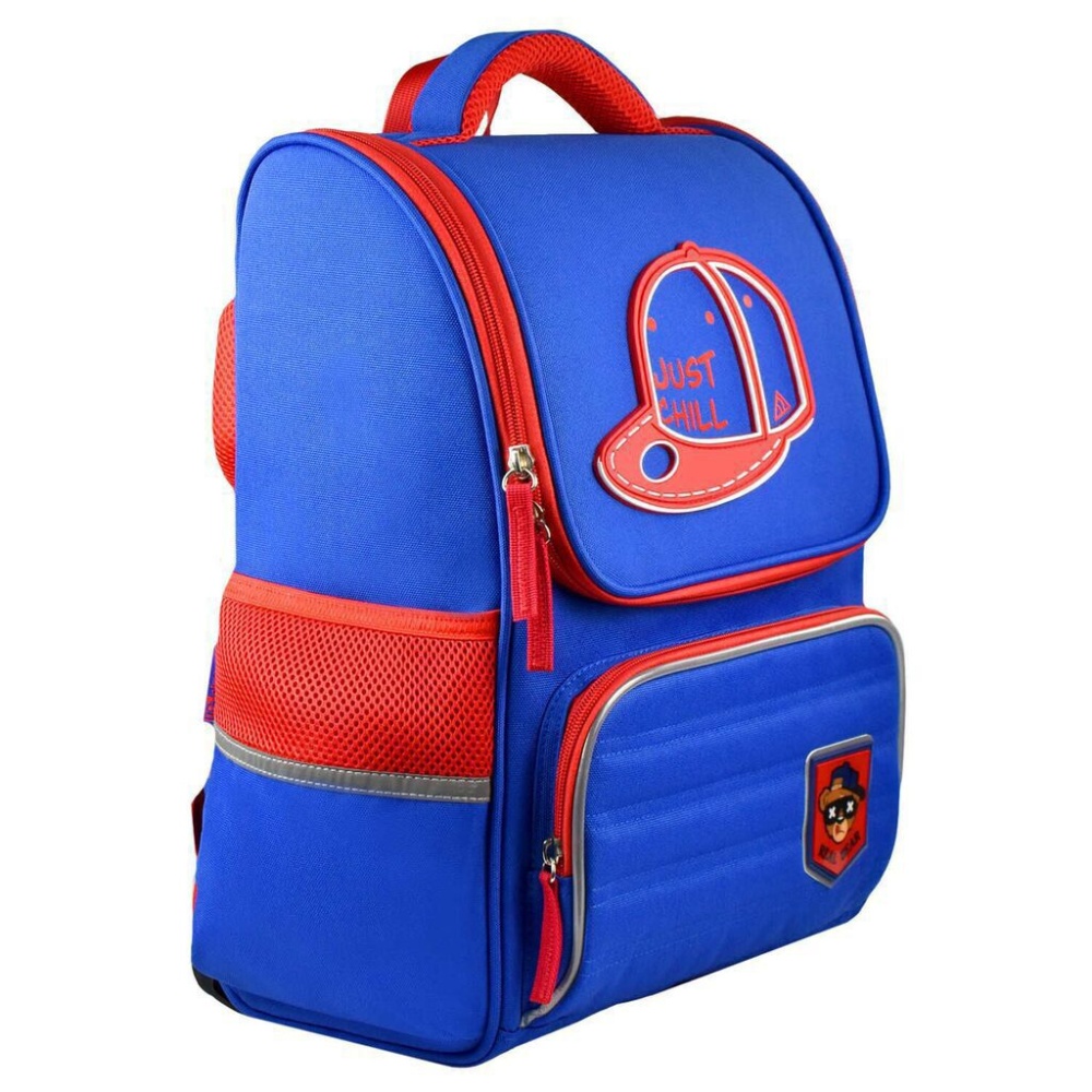 Рюкзак школьный. БЕЙСБОЛКА. Размер: 30,5x38x16 см. Материал: полиэстер. Количество отделений - 1. Внутренняя организация: мягкие разделители, резинка-фиксатор. Застёжка - молния. Материал собачки: лента репсовая. Форма собачки: хляст. Количество наружных карманов - 3. Тип спинки - формоустойчивая спинка из сетчатой ткани и поролона. Тип дна - с пластиковыми ножками. Отделка: пластиковая нашивка, резиновая нашивка, шелкография в одну краску. Цвет - синий. Особенности: водоотталкивающая ткань, лямки, регулируемые по длине, светоотражающие элементы. Подклада: брендированная подклада. Индивидуальная упаковка: ПЭТ-пакет.