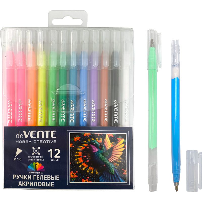 Набор ручек гелевых акриловых "deVENTE. HOBBY CREATIVE" 12 шт, 12 цветов, d=1 мм, прозрачно-матовый круглый корпус, колпачок с клипом, увеличенный запас чернил, специальные акриловые чернила c высокой яркостью на черной бумаге, в пластиковой коробке
