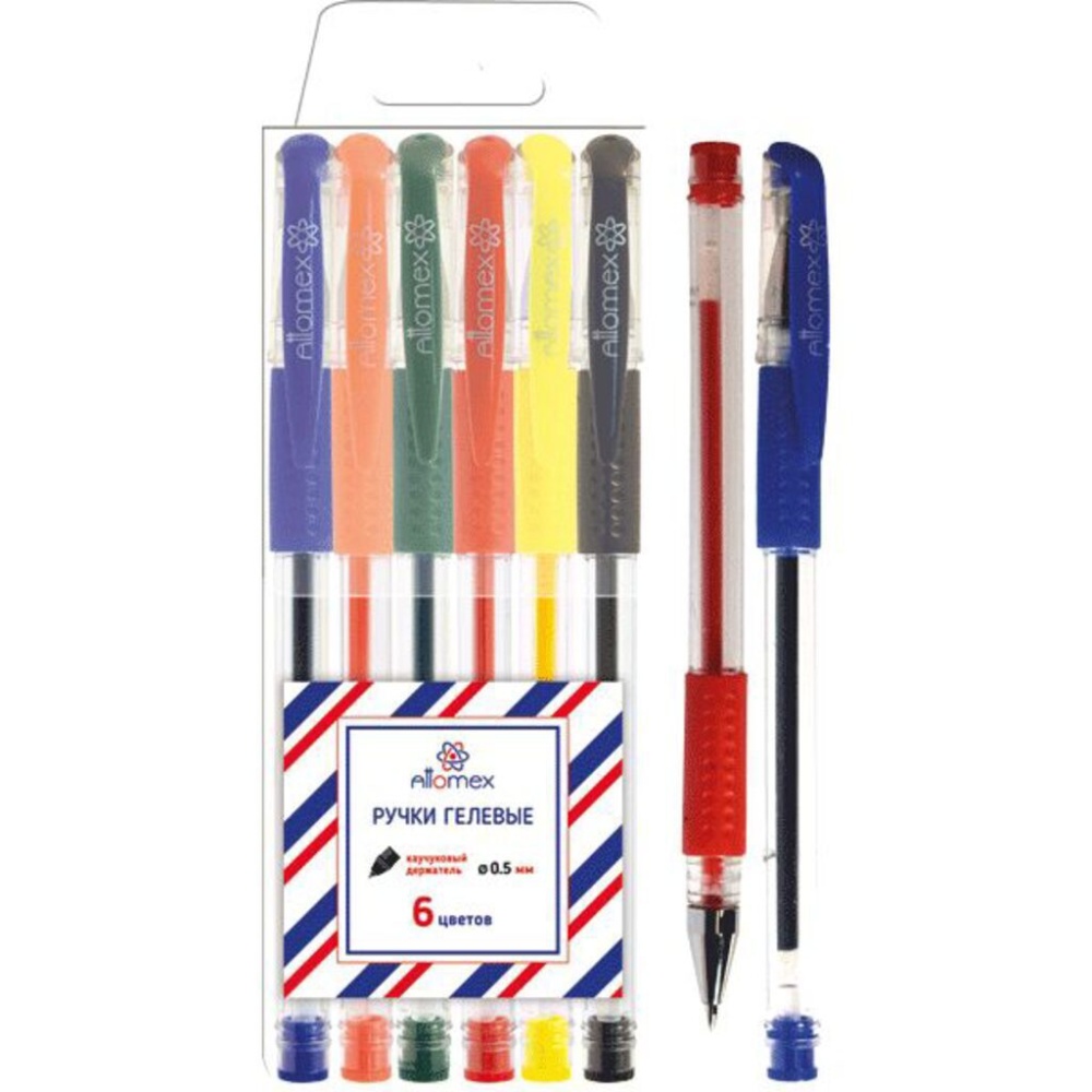 Набор ручек гелевых "Attomex" 06 стандартных цветов, d=0,5 мм, прозрачный корпус с металлическим наконечником и каучуковым держателем, сменный стержень, в пластиковом блистере