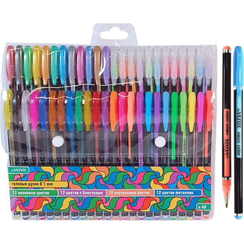Набор ручек гелевых "deVENTE. Neon Black" 48 цветов, d=1 мм, черный корпус с цветными полосами, сменный стержень, в пластиковом блистере