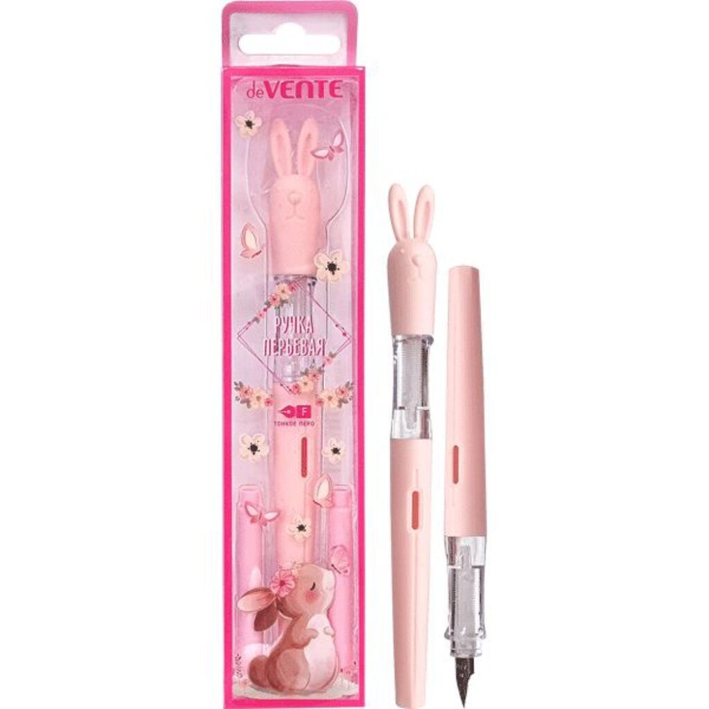 Ручка перьевая "deVENTE. Зайка" перо тонкое F (Fine), в комплекте с 2-мя баллончиками 0,8 мл, синие чернила, розовый корпус с трехгранной грип-зоной и с декоративным элементом на колпачке, в пластиковой упаковке