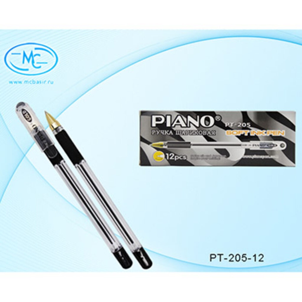 Ручка шариковая: на масляной основе, "Piano GOLD", прозрачный корпус, резиновый рефлённый держатель, наконечник золотистого цвета, игольчатый стержень, прозрачный колпачок, толщина пишущего наконечника 0,5 mm, цвет чернил-черная.