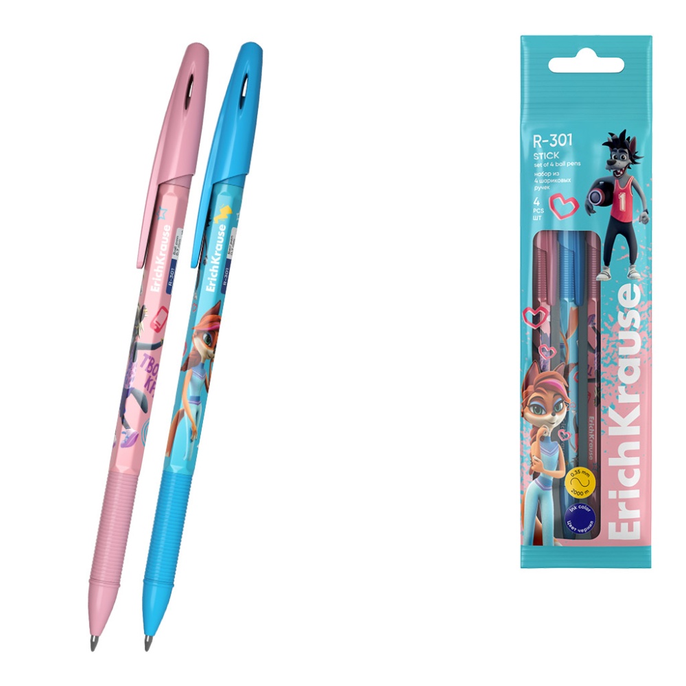 Набор из 4 ручек шариковых ErichKrause R-301 Stick Ну, Погоди! Каникулы для девочки 0.7, цвет чернил