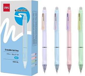 Ручка гелевая автоматическая, стираемая, обеспечивает мягкое и качественное письмо. Пулевидный наконечник 0,5мм, мягкий трехгранный грип, круглый корпус, синие чернила. Цвет корпуса в ассортименте.