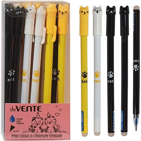 Ручка гелевая стираемая "deVENTE. Glad cat" d=0,5 мм, цвета корпуса ассорти, с декоративным элементом в форме кошек на колпачке, с ластиком, сменный стержень, индивидуальная маркировка, синяя