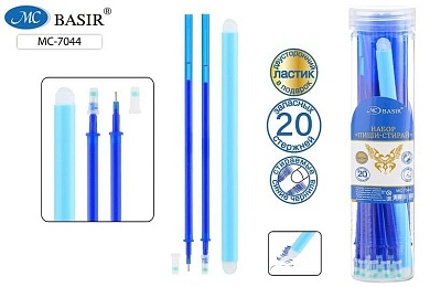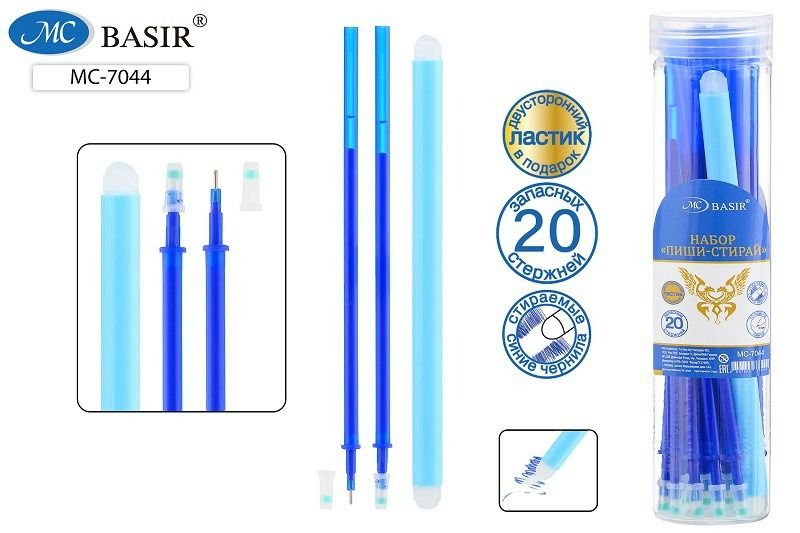 Набор стержней гелевых стираемых Basir 20шт., синий, 129мм + двусторонний ластик