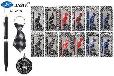 Набор подарочный мужской: брелок для ключей в виде галстука (материал атлас) /ассорти/+авторучка с поворотным механизмом+компос; в подарочной пластиковой упаковке /16*9 см/.