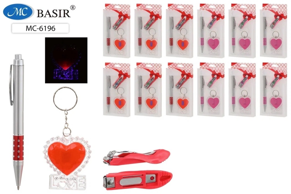 Набор подарочный женский: брелок для ключей в виде сердечка с фонариком +авторучка+кусачки для ногтей; в подарочной пластиковой упаковке /16*9 см/.