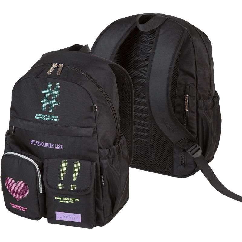 Рюкзак "deVENTE. Air Jump. Favorite List" подростковый 40x31x20 см (18 л) 500 г, матовый полиэстер с водоотталкивающей пропиткой, подклад, 1 отделение на молнии с уплотненным отделением для ноутбука до 15 дюймов и книг, 1 передний карман на молнии, 2 боковых кармана, 1 потайной карман анти-вор в спинке, уплотненная вентилируемая спинка и уплотненные лямки, аппликация, каучуковая аппликация