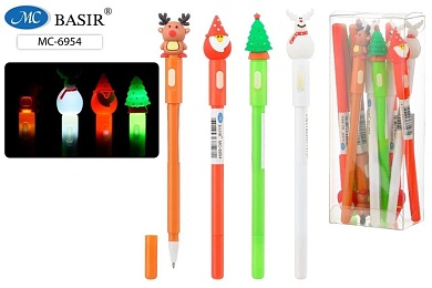 Ручка детская шариковая "НОВОГОДНИЕ"; прорезиненный наконечник фонарик-Де