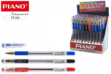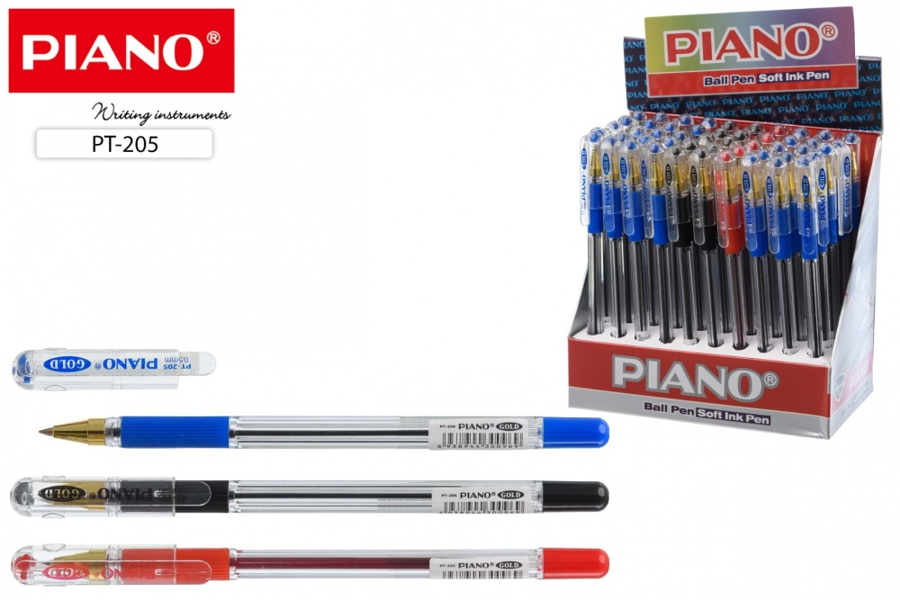 Ручка шариковая: на масляной основе, "Piano GOLD", прозрачный корпус, резиновый рефлённый держатель, наконечник золотистого цвета, игольчатый стержень, прозрачный колпачок, (3 цв: 35-синих, 10-чёрных, 5-красных).толщина пишущего наконечника 0,5 mm.