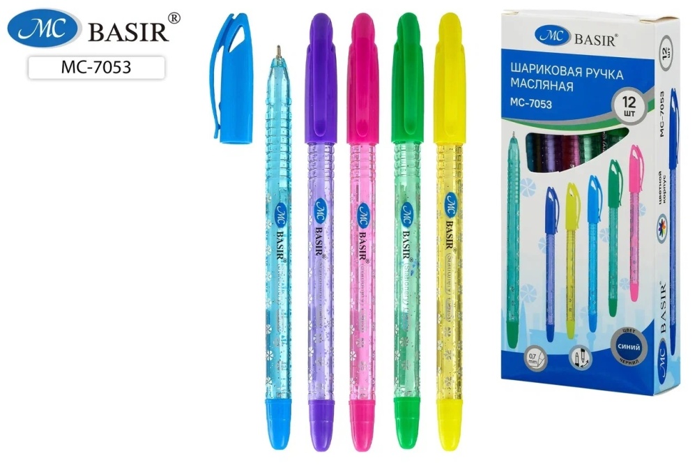 Шариковая ручка с чернилами на масляной основе: тонированный, пластиковый цветной с рисунком корпус .ассорти., цветной колпачок, 0,7 mm, цвет чернил-синий.