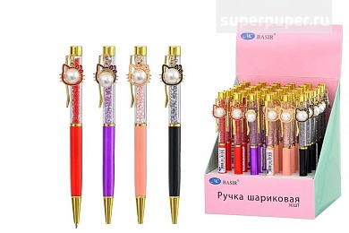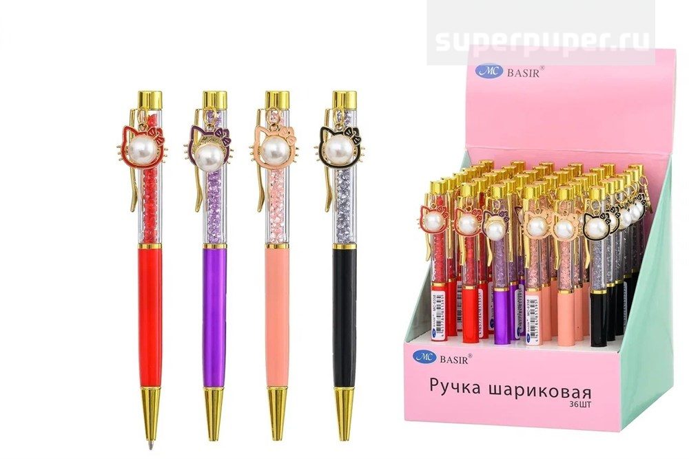 Шариковая ручка с поворотным механизмом; с подвеской-КОТЁНОК (с жемчугом); комбинированный корпус-нижняя часть корпуса -цветная .ассорти., прозрачная часть корпуса с наполнителем-стразы, цвет чернил-синий.