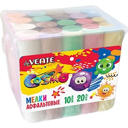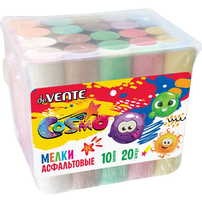Мелки асфальтовые "deVENTE. Cosmo" 20 шт (10 цв) в форме усеченного конуса, высота мелка 10,5 см, верхний диаметр 2,2 см, нижний диаметр 2,5 см, СПЕЦИАЛЬНАЯ ФОРМУЛА для гладкого рисования, в пластиковой коробке