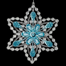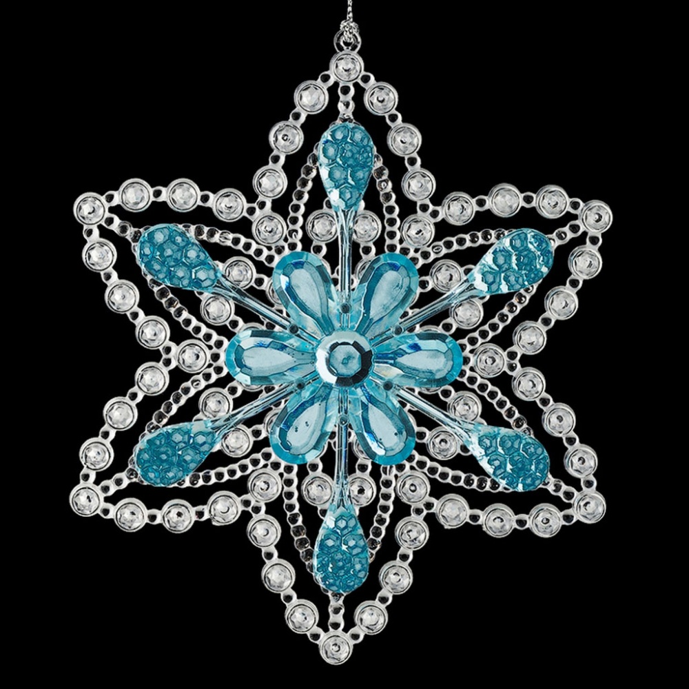 Изящная снежинка состоит из двух слоев - задняя часть представляет собой прозрачное основание, выполненное с эффектом пузырьков, а спереди изделие украшает цветок из голубых крупных страз. Техническая упаковка - полиэтиленовый пакет, только для безопасной транспортировки и хранения.