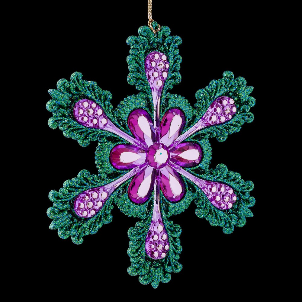 Внутрення часть снежинки декорирована крупными фиолетовыми стразами с золотыми вкраплениями. Края и обратная сторона украшения покрыты сверкающими блестками цвета аквамарин. Техническая упаковка - полиэтиленовый пакет, только для безопасной транспортировки и хранения.