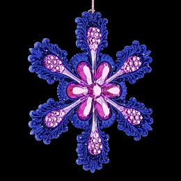 Внутрення часть снежинки декорирована крупными фиолетовыми стразами с золотыми вкраплениями. Края и обратная сторона украшения покрыты сверкающими блестками цвета аметиста. Техническая упаковка - полиэтиленовый пакет, только для безопасной транспортировки и хранения.