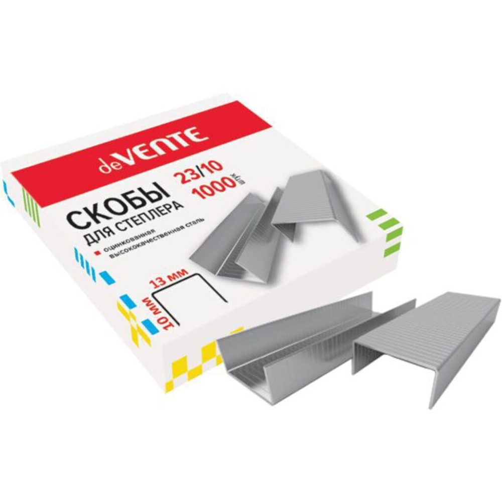 Скобы для степлера "deVENTE" 23/10 оцинкованный металл предназначены для степлеров со сшивающей способностью до 40 листов. В картонной упаковке содержится 1000 скоб.