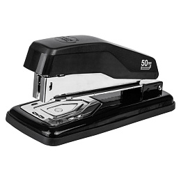 Устойчивое нескользящее основание. Верхняя часть степлера поворотная, что позволяет скреплять бумагу в трёх направлениях. Скрепление открытое и закрытое, с функцией забивания. Количество пробиваемых листов: от 2 до 50. Тип и размер скоб для степлера: 24/6, 26/6, 24/8 Емкость загрузки скоб: не больше 100 шт. Глубина закладки бумаги: 57 мм.