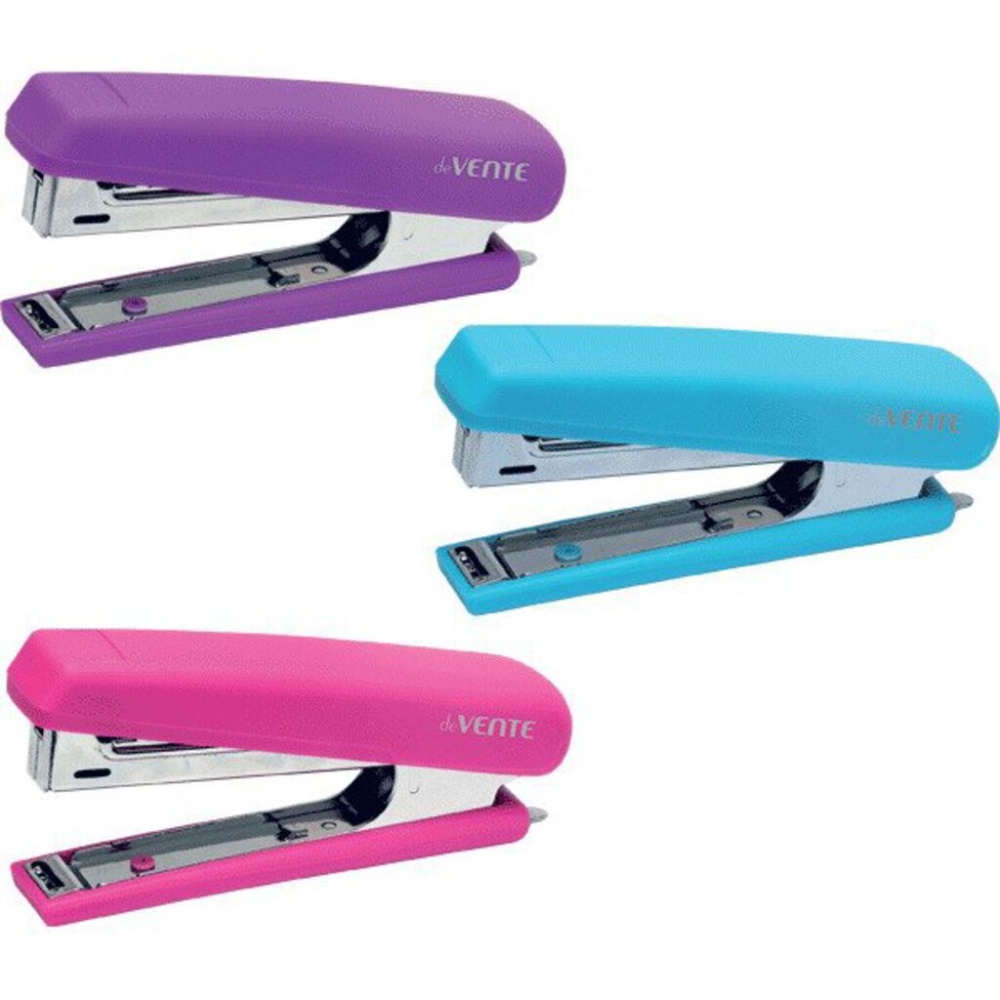 Степлер "deVENTE. Soft Touch" 10 (мощность 12 листов) пластиковый с бархатистым прорезиненным покрытием, со встроенным металлическим антистеплером, в картонной коробке, ассорти 3 цвета (фиолетовый, голубой и розовый) Глубина сшивания 50мм