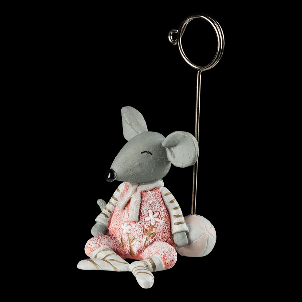 Мышонок в розовом костюме - оригинальный настольный сувенир. Изделие отличается компактным размером и тонко прорисованными деталями. Металлическое кольцо прочно фиксирует фотографию или визитную карточку. Групповая упаковка предназначена только для безопасной транспортировки и хранения.