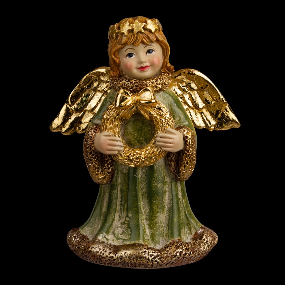 Трогательный ангел держит в руках рождественский венок. Изделие отличается качественной детализацией, рельеф тонко прорисован. Классическое праздничное сочетание зеленого и золотого цвета создает атмосферу новогоднего волшебства. Милый сувенир украсит интерьер и станет символическим подарком для друзей или коллег. Групповая упаковка предназначена только для безопасной транспортировки и хранения.