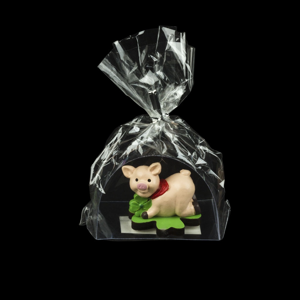 Поросенок, лежащий на клевере, принесет его обладателям удачу в наступающем году. Небольшой по размеру и оснащенный липучкой, сувенир подходит для декорирования подарков и окружающего пространства. Упаковка - прозрачная подложка из ПВХ в пакете с подарочной ленточкой.