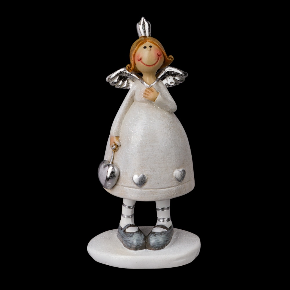 Мультяшный ангел держит в руке сердечко. Крылья, корона и сердце покрыты сверкающей краской. Нежное сочетание белого и серебряного цвета создает атмосферу зимнего волшебства. Милый сувенир украсит интерьер и станет символическим подарком для друзей или коллег. Групповая упаковка предназначена только для безопасной транспортировки и хранения.