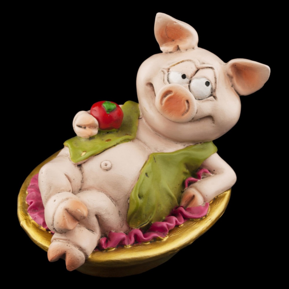 Забавный поросенок, лежащий на блюде с яблоком в копытце - веселый и обаятельный сувенир. Упаковка - пенопластовое ложе внутри индивидуальной крафтовой коробки, только для безопасной транспортировки и хранения.