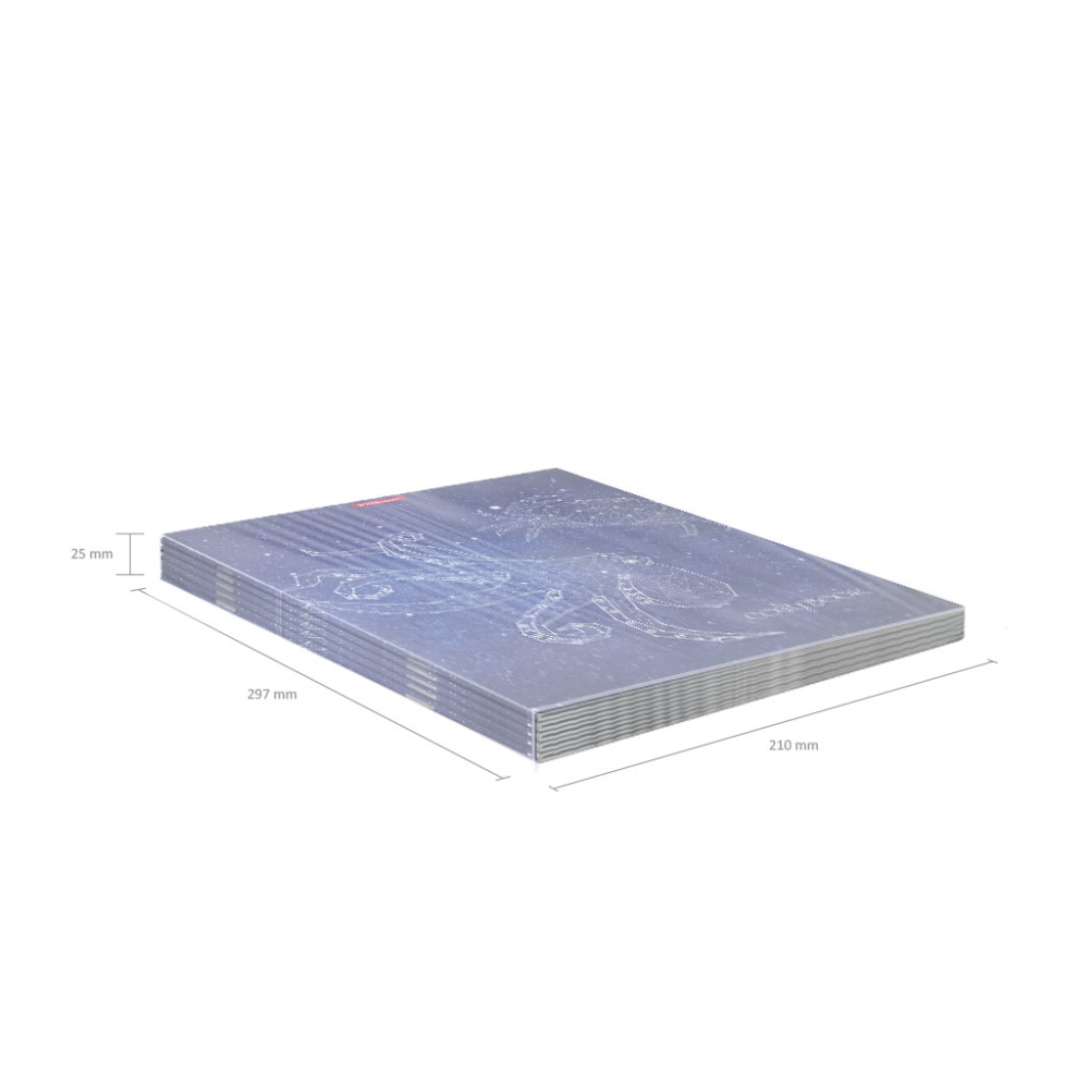 Тетрадь общая ученическая формата А4 (210х297 мм). Двойная обложка: внешняя выполнена из высококачественного износостойкого матового пластика с фактурой песок и печатью белой краской, внутренняя из плотной мелованной бумаги с многоцветной печатью. В блоке 48 листов в клетку. Бумага офсетная плотностью 60 г/м2. Цвет линовки синий. Скругленные уголки обложки и блока. Тип скрепления скоба. Тетради одного дизайна упакованы в термоусадочную пленку по 5 штук.