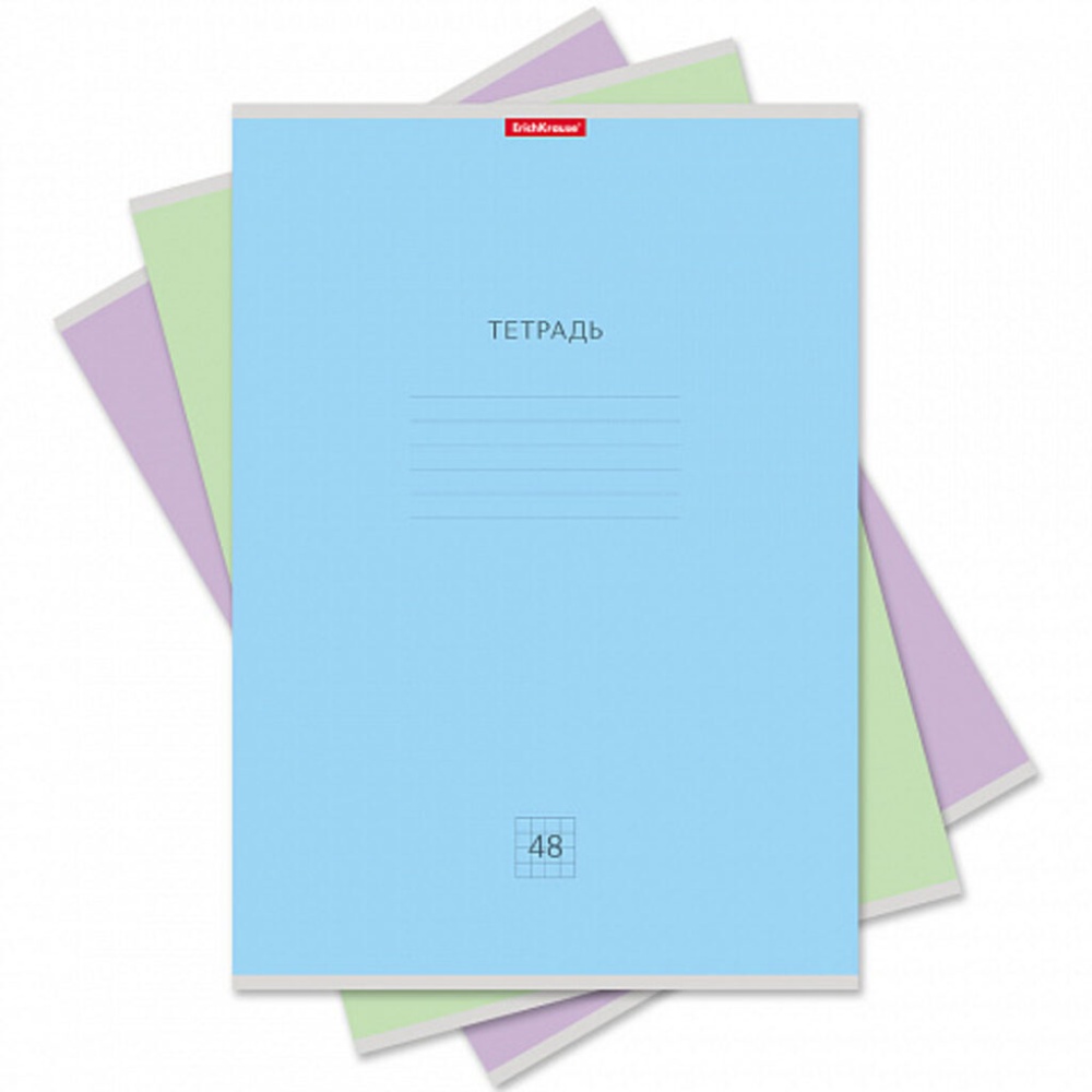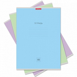 Тетрадь общая ученическая формата А4 (210х297 мм). Обложка из высококачественного мелованного картона плотностью 190 г/м2. В блоке 48 листов в клетку с полями. Бумага офсетная плотностью 60 г/м2. Цвет линовки - синий. Скругленные уголки обложки и блока. Тип скрепления - скоба. Тетради разных цветов упакованы в термоусадочную пленку по 6 штук.