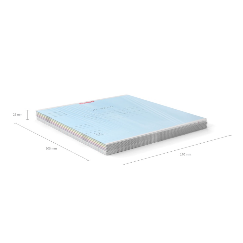 Тетрадь школьная ученическая формата А5+ (170х203 мм). Обложка из высококачественного мелованного картона плотностью 180 г/м2. В блоке 12 листов в линейку с полями. Бумага офсетная плотностью 60 г/м2. Цвет линовки - синий. Скругленные уголки обложки и блока. Тип скрепления - скоба. Тетради разных цветов упакованы в термоусадочную пленку по 10 штук.