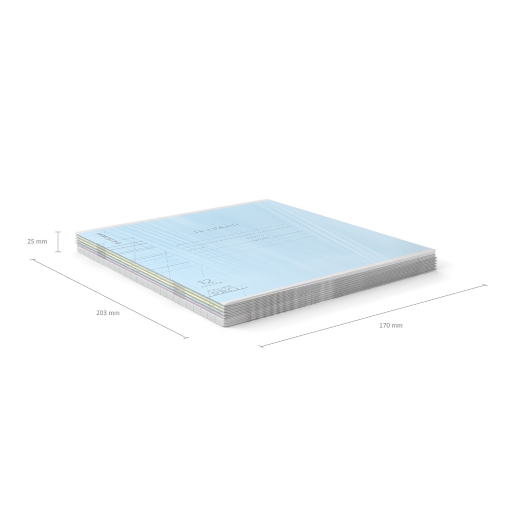 Тетрадь школьная ученическая формата А5+ (170x203 мм). Двойная обложка: внешняя выполнена из высококачественного износостойкого прозрачного пластика с текстурой зеркало, внутренняя из качественной мелованной бумаги. В блоке 12 листов в косую линейку. Бумага офсетная плотностью 60 г/м2. Цвет линовки синий. Скругленные уголки обложки и блока. Тип скрепления скоба. Тетради разных цветов упакованы в термоусадочную пленку по 10 штук.