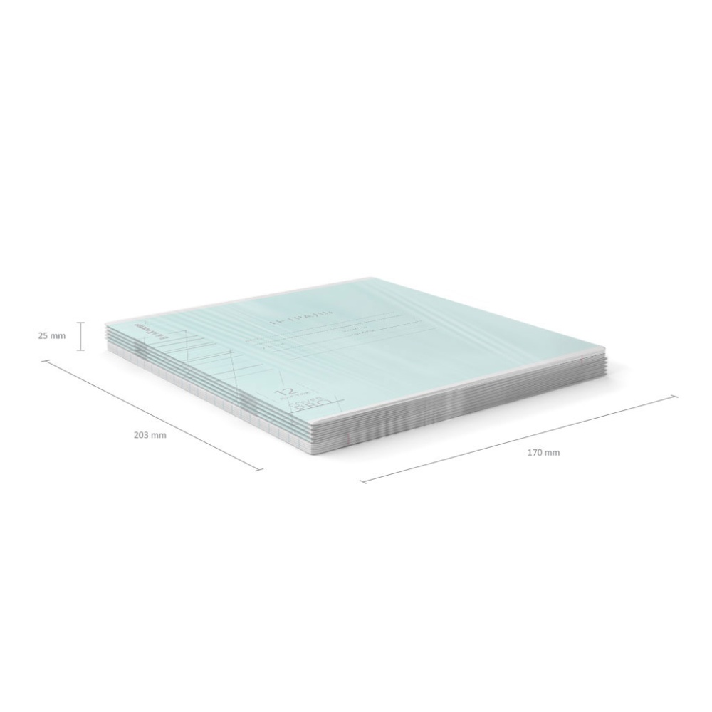 Тетрадь школьная ученическая формата А5+ (170x203 мм). Двойная обложка: внешняя выполнена из высококачественного износостойкого прозрачного пластика с текстурой апельсин, внутренняя из качественной мелованной бумаги. В блоке 12 листов в косую линейку. Бумага офсетная плотностью 60 г/м2. Цвет линовки синий. Скругленные уголки обложки и блока. Тип скрепления скоба. Тетради упакованы в термоусадочную пленку по 10 штук.