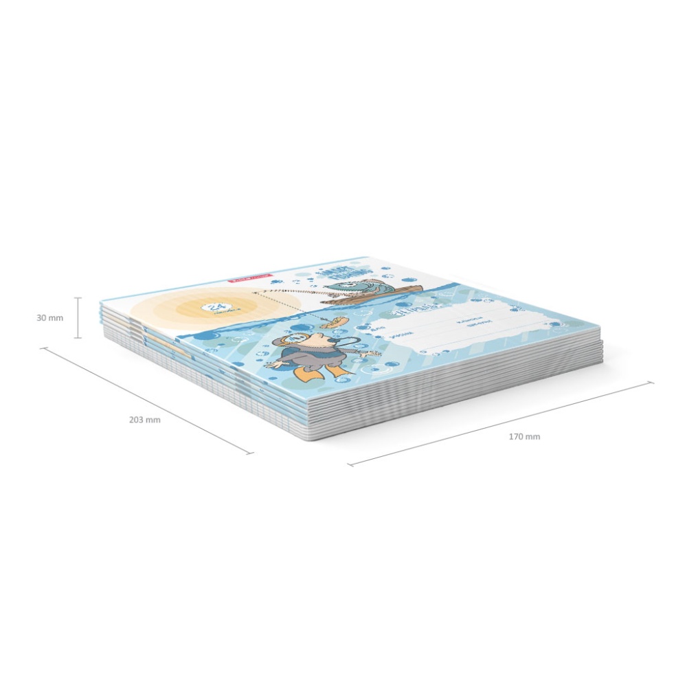 Тетрадь школьная ученическая формата А5+ (170х203 мм). Обложка из высококачественного мелованного картона плотностью 180 г/м2. В блоке 24 листа в линейку с полями. Бумага офсетная плотностью 60 г/м2. Цвет линовки - синий. Скругленные уголки обложки и блока. Тип скрепления - скоба. Тетради упакованы в термоусадочную пленку по 10 штук.