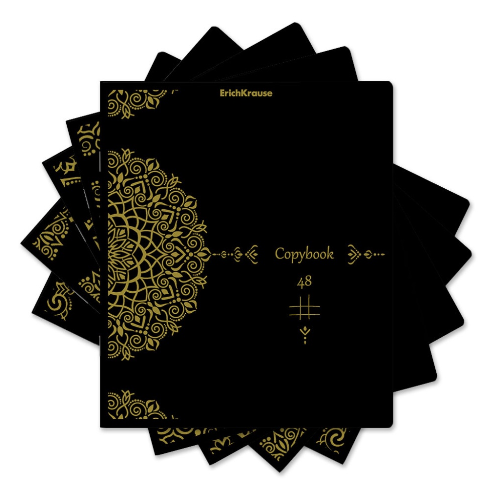 Тетрадь общая формата А5+ (170х203 мм). Обложка из высококачественного крашенного в массе черного картона плотностью 180 г/м2. Отделка обложки - тиснение золотой фольгой. В блоке 48 листов в клетку с полями. Бумага офсетная плотностью 60 г/м2. Белизна бумаги - 100%. Цвет линовки - синий. Скругленные уголки обложки и блока. Тип скрепления - скоба. Тетради упакованы в термоусадочную плёнку по 5 штук.