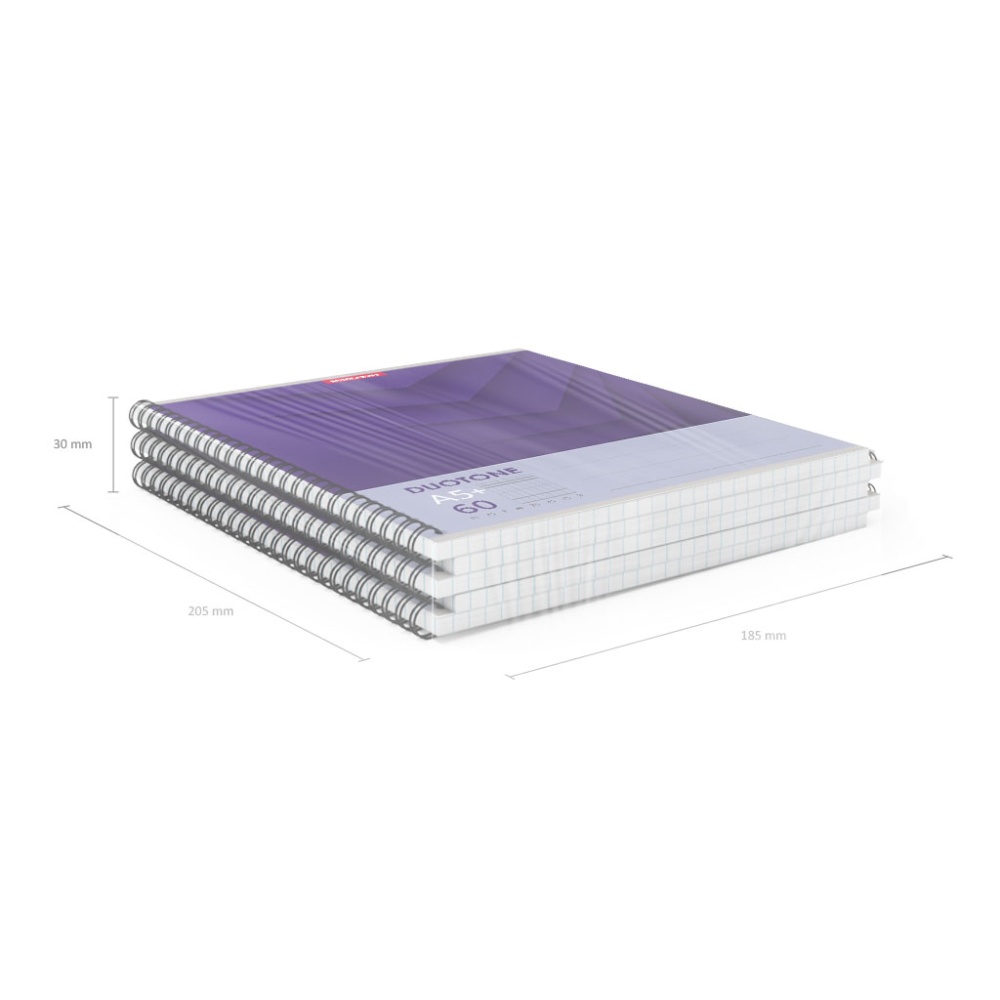 Тетрадь общая формата А5+ (170х205 мм). Обложка из высококачественного мелованного картона плотностью 190 г/м2. Плотная подложка 340 г/м2. В блоке 60 листов в клетку. Бумага офсетная плотностью 60 г/м2. Цвет линовки - синий. Тип скрепления - спираль. Тетради разных цветов упакованы в термоусадочную пленку по 4 штуки.