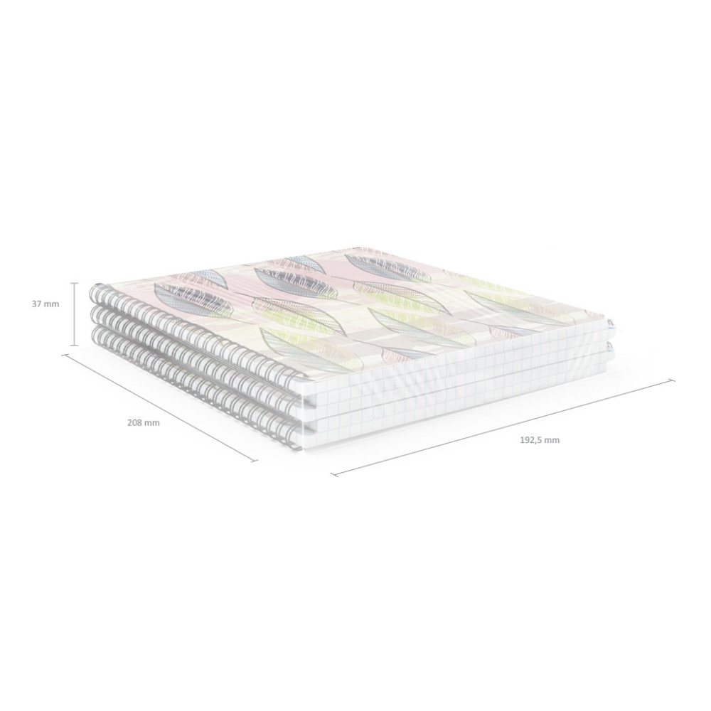 Тетрадь общая формата А5+ (170х205 мм). Обложка из высококачественного износостойкого матового пластика с фактурой песок. Эффектный стильный дизайн выполнен офсетной печатью в нежных тонах. В блоке 60 листов в клетку. Бумага офсетная плотностью 55 г/м2. Цвет линовки - синий. Скругленные уголки обложки. Тип скрепления - спираль. Тетради упакованы в термоусадочную пленку по 5 штук.