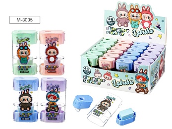 Точилка пластик.с контейнером. ЗУБАСТИК (Лабубу), 2 отверстия, ластик, 4 дизайна