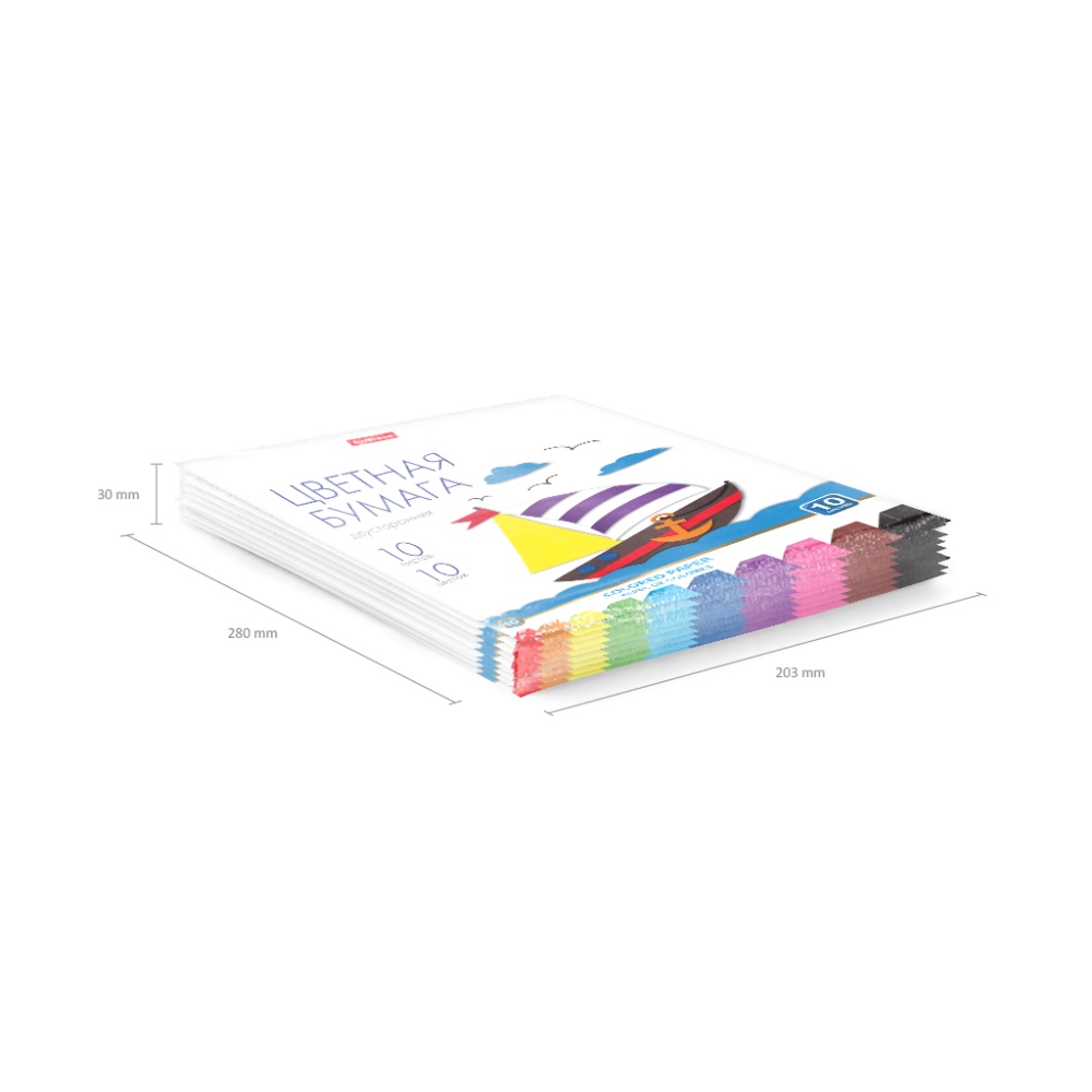 Цветная бумага немелованная двусторонняя формата А4 (203х280 мм). Яркие насыщенные цвета. 10 листов, 10 цветов. Плотность наполнения 80 г/м2. Тип скрепления клей. На внутренней стороне обложки приводятся инструкции по изготовлению поделок. Упакована в термоусадочную пленку по 10 штук.