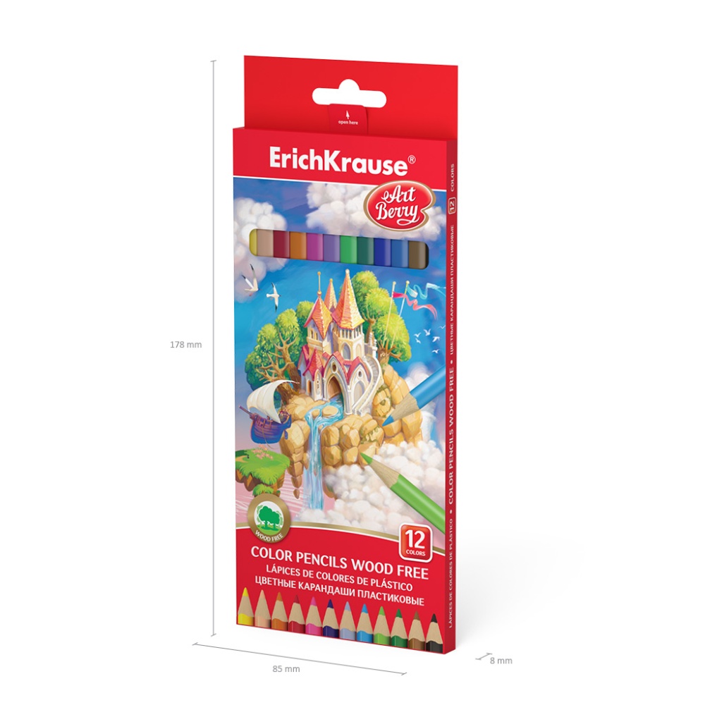 Пластиковые цветные карандаши ArtBerry представлены широкой палитрой оттенков, которые позволяют создавать яркие реалистичные рисунки. Регулируя силу нажима, можно контролировать насыщенность оттенков и плавность перехода цветов. Благодаря эргономичной трехгранной форме, карандаши удобно лежат в руке и не доставляют дискомфорта даже при длительном использовании. Специальная технология изготовления карандаша методом экструзии надежно фиксирует грифель к корпусу, что обеспечивает высокую ударопрочность. Идеальная центровка грифеля и пластичность материала карандаша гарантируют легкую заточку с экономным расходом карандаша. Грифель диаметром 3 мм не царапает бумагу, не крошится при рисовании и не ломается даже при сильном нажатии. Специальный клапан на упаковке обеспечивает легкое открытие и закрытие коробки. Европейский сертификат качества (СЕ) гарантирует отсутствие в составе токсичных веществ. Цвета в наборе: 1. Желтый, 2. Оранжевый, 3. Красный, 4. Розовый, 5. Лососевый, 6. Лиловый, 7. Синий, 8. Голубой, 9. Салатовый, 10. Зеленый, 11. Коричневый, 12. Черный.